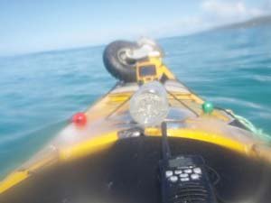Conditions stayed calm until about 2.00pm when the North Easter started but it did not get over 10 knots until about 3.30pm. About that time I had covered well over 40km. Maybe I was tired or maybe I was just unlucky but I got caught inside a break. There were a number of sand bars off shore and I had been careful to stay outside them but a really big wave came in outside me and broke on a bar that had not been visible. I headed into the wave, but 50m before it got to me the top third broke. It swept me backwards for about 100m before tipping me over sideways. Some minor items were lost, like the baling sponge but I still had a water bottle that I could bale with.