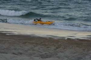 Interestingly, the kayak is easier to turn back over with the back wheels down. After 25minutes I had enough water out to set off. The pace was as fast as I could go to get to the beach exit point before dark. With the sun going down I hit the sand nicely only to have a wave come in behind me and wash the kayak back out before I could get out. We let it roll around until it washed onto the beach far enough to turn it over and empty it before calling it quits for the day.