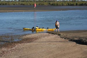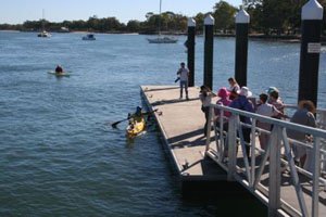 The weather was perfect with hardly any breeze. After a reception at the Bongaree jetty and a radio interview it was off across the bay to Scarborough. There wasnít much to see except for a few boats trying their luck with the fish. The horizon gradually changes though and as you get closer to shore the features start to make sense.