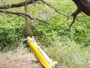 The first water hyacinth raft was only a few kilometres upstream and it was 900m long. Some of the bank was easy to walk on but some was quite difficult. The re-entry to the river wasn't easy and I had to let the kayak go. All that was nothing compared with the effort to get through the 10m or so out to open water. There was a vine growing on the hyacinth that necessitating cutting with the paddle after every 300mm. After half an hour I took a photo of how far I had got - not far really. In all the entry to open water took over an hour.