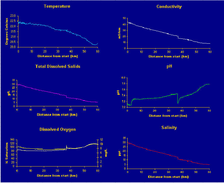 Total Dissolved Solids is a measure of dissolved minerals in solution. It is closely related to conductivity and salinity. High levels mean lower water quality. Here it is measure in grams per litre (g/L)