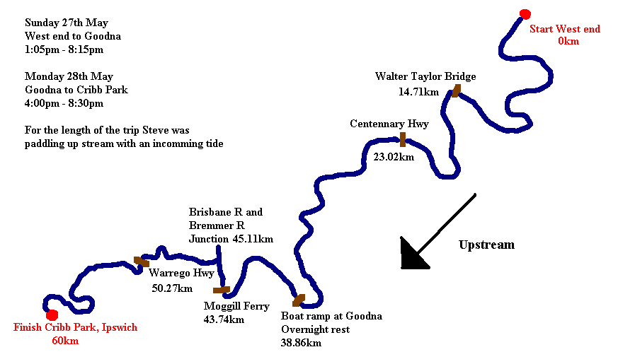 For the fist leg of the trip, Steve was towing a probe supplied by Dr. Peter Pollard (Australian Rivers Institute, Griffith University). This was attached to the front of the kayak and sat about 40cm below the surface. The purpose was to measure water quality parameters over the entire length of the river from West End Brisbane (where Steve started) to Cribb Park Ipswich (where Steve started to walk). The information will be used in an ongoing ecosystem health assessment of the Brisbane and Bremmer Rivers.